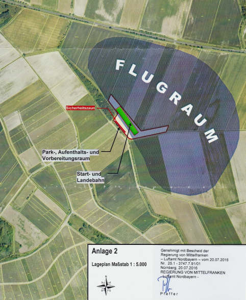 Als Flugraum gilt ausschließlich der Bereich nordöstlich der Start- und Landebahn, wie im Lageplan in der Anlage 2 der Alterlaubnis der Regierung von Mittelfranken vom 20.07.2016 (siehe unten) dargestellt (also grob das Gelände zwischen Sicherheitsnetz, der Kreisstraße Großlangheim-Wiesenbronn und dem asphaltierten Zufahrtsweg zum Fluggelände).